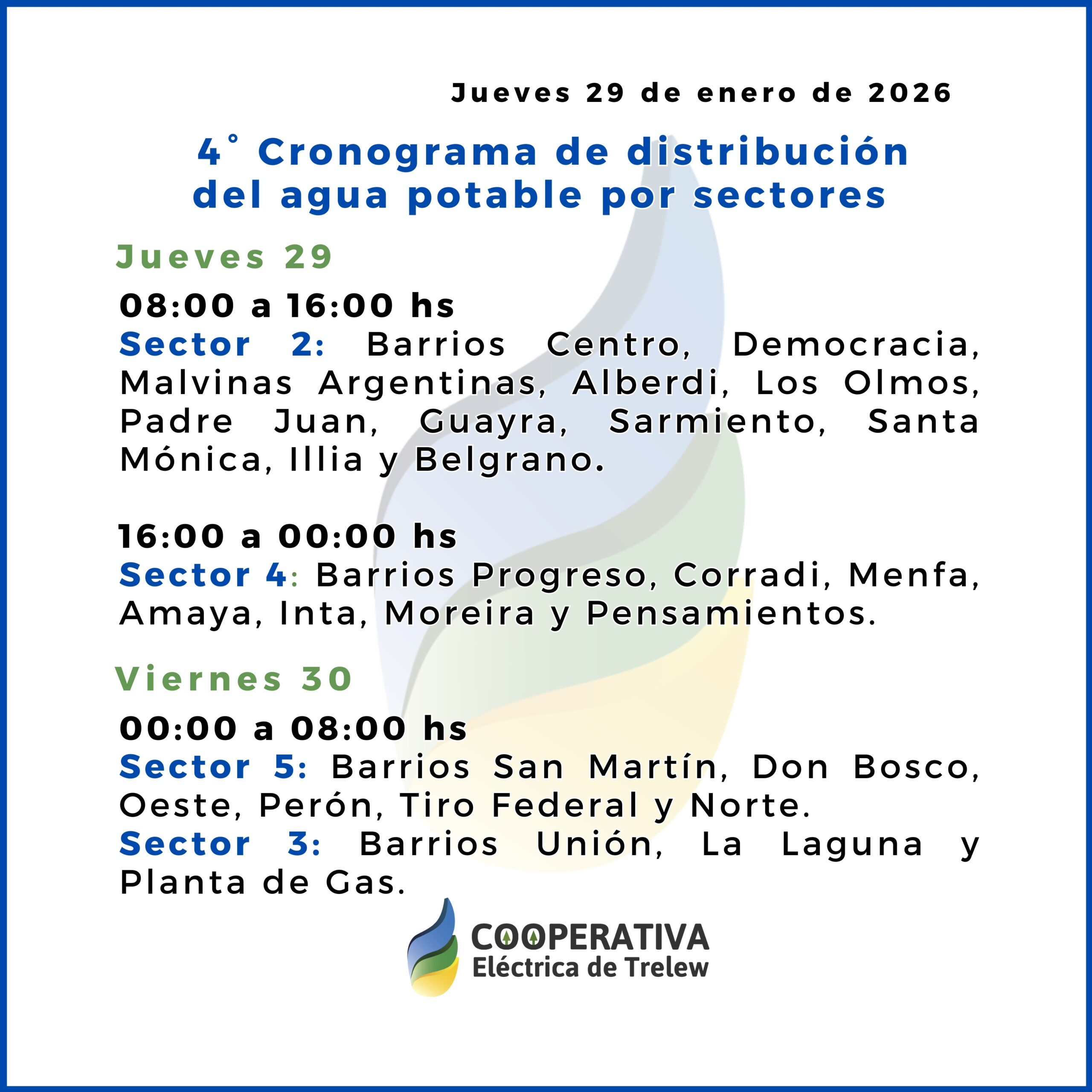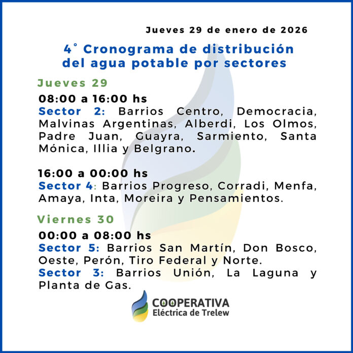 La Cooperativa Eléctrica de Trelew informa a la comunidad que este jueves 29 de enero se reitera el cronograma de distribución sectorizada de agua potable, que se anunció en el día de ayer, en el marco de la emergencia sanitaria que atraviesa la ciudad.
