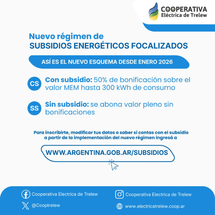 La Cooperativa Eléctrica de Trelew informa a la comunidad que, a partir de enero de 2026, entró en vigencia el nuevo Régimen de Subsidios Energéticos Focalizados (SEF), establecido mediante el Decreto Nacional N.º 943/2025, que introduce cambios en la forma en que se aplican las bonificaciones sobre el consumo eléctrico.