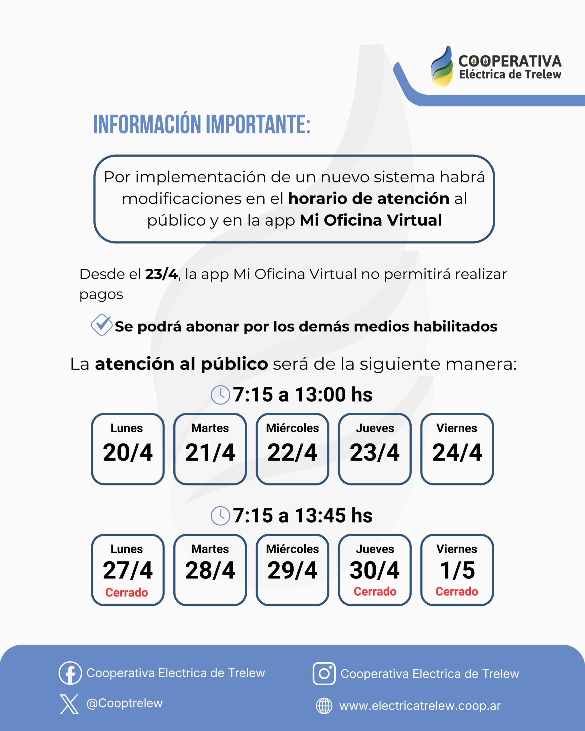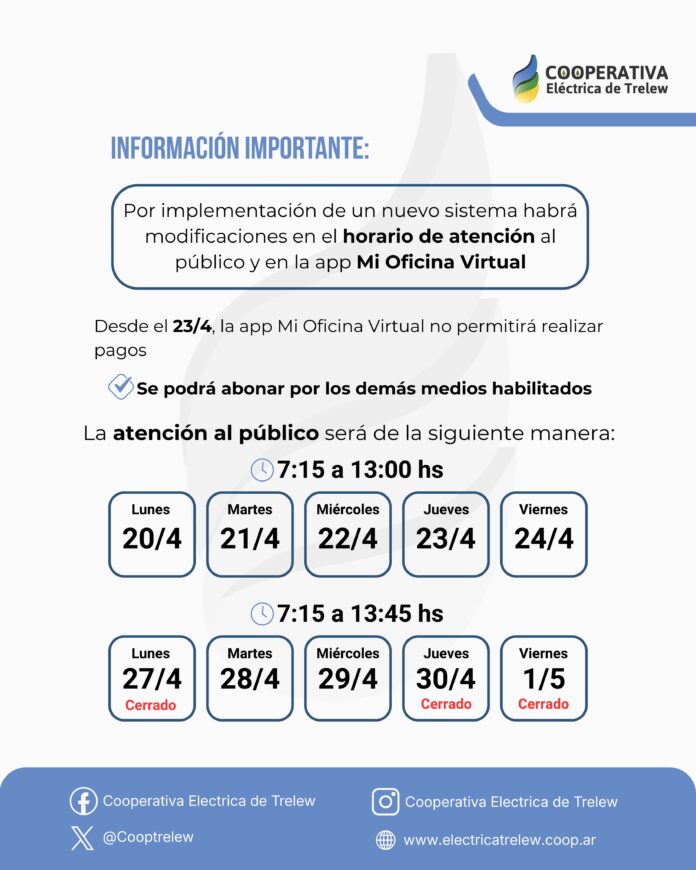 Por otra parte, el lunes 27 de abril las oficinas permanecerán cerradas con el objetivo de ultimar detalles vinculados a la puesta en marcha del nuevo sistema.